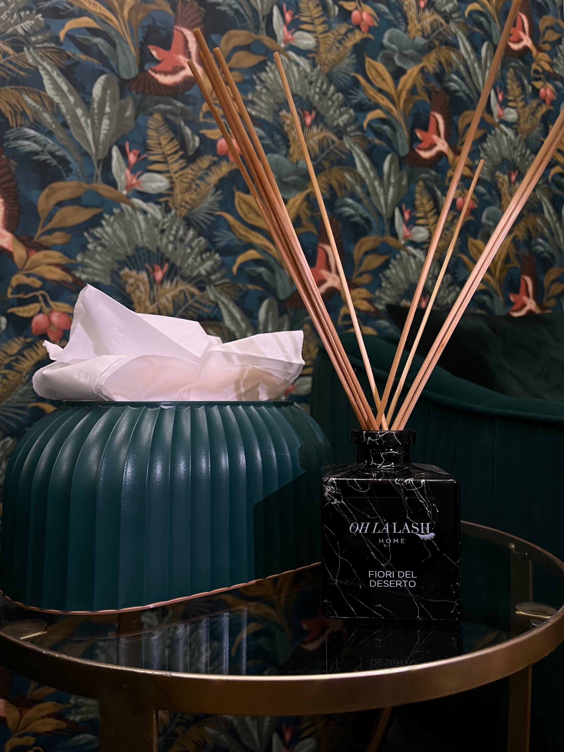 Il tutto è racchiuso in un cubo in vero marmo naturale, un oggetto d’arredo prezioso e unico, che impreziosisce qualsiasi ambiente con eleganza. I bastoncini di legno diffondono costantemente il profumo, sprigionando una scia calda e sofisticata, ideale per valorizzare spazi esclusivi.